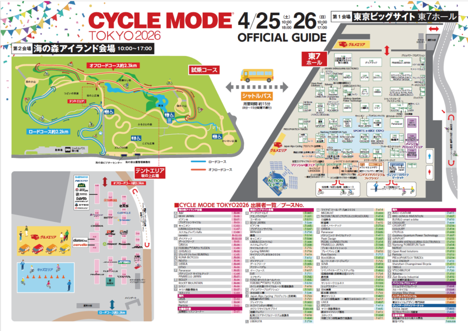 | 内容詳細 | 開催概要 ■名称 CYCLE MODE TOKYO 2026 ■会場 第1会場:東京ビッグサイト東7ホール 第2会場:海の森公園アイランド会場 ※会場間の移動は、シャトルバスを運行します。 ■日時 2026年4月25日(土)~26日(日) 10:00~18:00 ※海の森アイランド会場は両日17:00まで ※最終日は17:00まで ■入場料(税込) 【ビッグサイトチケット】※中学生以下無料 前売 1,500円 / 当日1,900円 【アイランドチケット】 ※4歳~中学生:550円 前売 2,050円 / 当日2,450円 ※【ビッグサイトチケット】→東京ビッグサイト内のみをお楽しみいただけます。【アイランドチケット】→ 東京ビッグサイト・海の森公園の両会場とシャトルバスをご利用できます。 ※前売チケットは公式HP、各種プレイガイドより購入可能▼チケット詳細に関しましては下記URLよりご確認ください。 https://www.cyclemode.net/ticket/ ※海の森アイランド会場は観覧無料でお楽しみいただけます。ただし、試乗を希望される方は、アイランドチケットの購入が必要です。