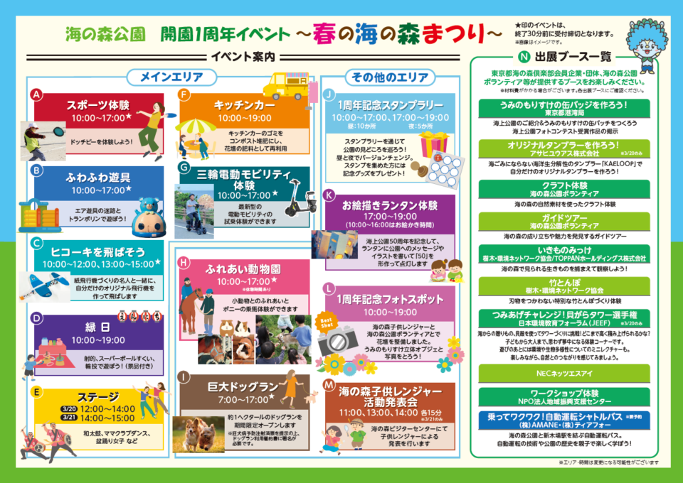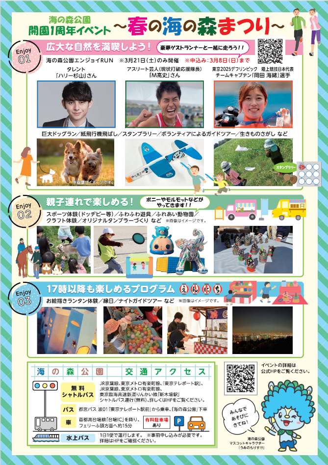 海の森公園開園1周年を記念して、「春の海の森まつり」が3月20日(金・祝)・21日(土)の二日間、開催されます!