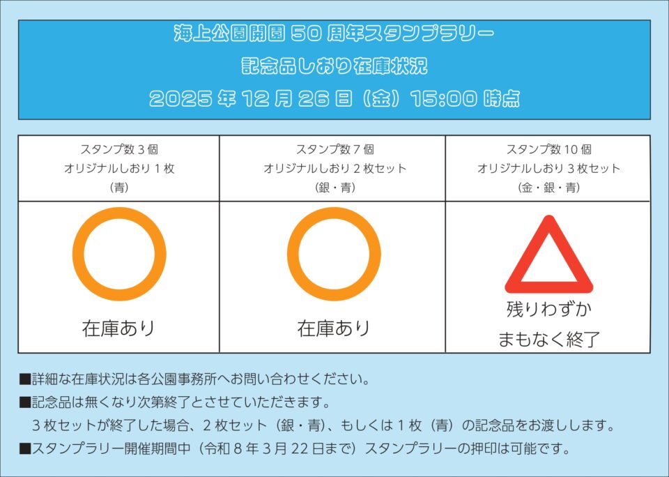 ニュース ホーム ニュース 海上公園開園50周年スタンプラリー記念品の在庫状況について お知らせ NEWS 海上公園開園50周年スタンプラリー記念品の在庫状況について 2025.12/27 ■スタンプ10個 しおり3枚セット(金・銀・青):在庫残りわずか ■スタンプ7個 しおり2枚セット(銀・青):在庫あり ■スタンプ3個 しおり1枚(青):在庫あり ※記念品はなくなり次第終了とさせていただきます。 ※しおり3枚セットが終了した場合、2枚セット(銀・青)の記念品をお渡しします。 海上公園開園50周年スタンプラリーの詳細はこちら ニュース一覧を見る お問い合わせはこちら