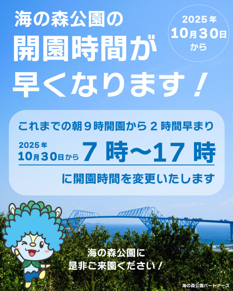 10月30日(木)より、海の森公園の開園時間が早まります!